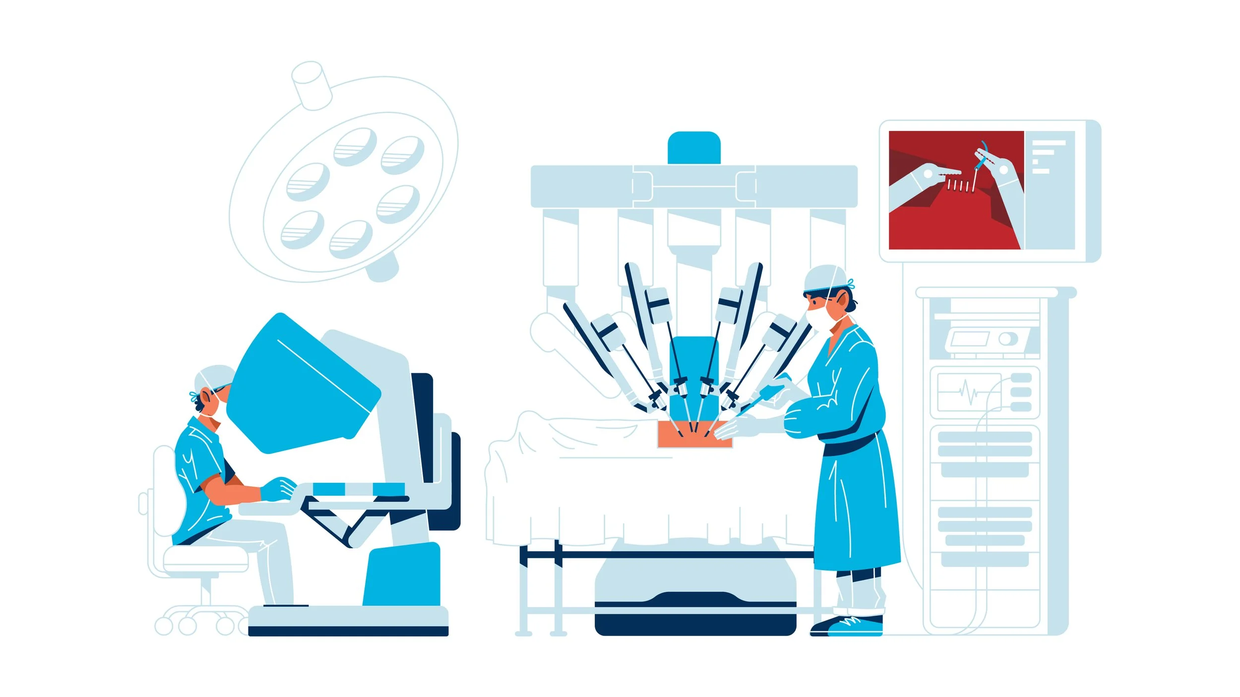 Vemos la consola del robot Da Vinci a la izquierda operada por un profesional, en medio los brazos realizando la operación y a la esquina superior derecha el monitor con el seguimiento por cámara.